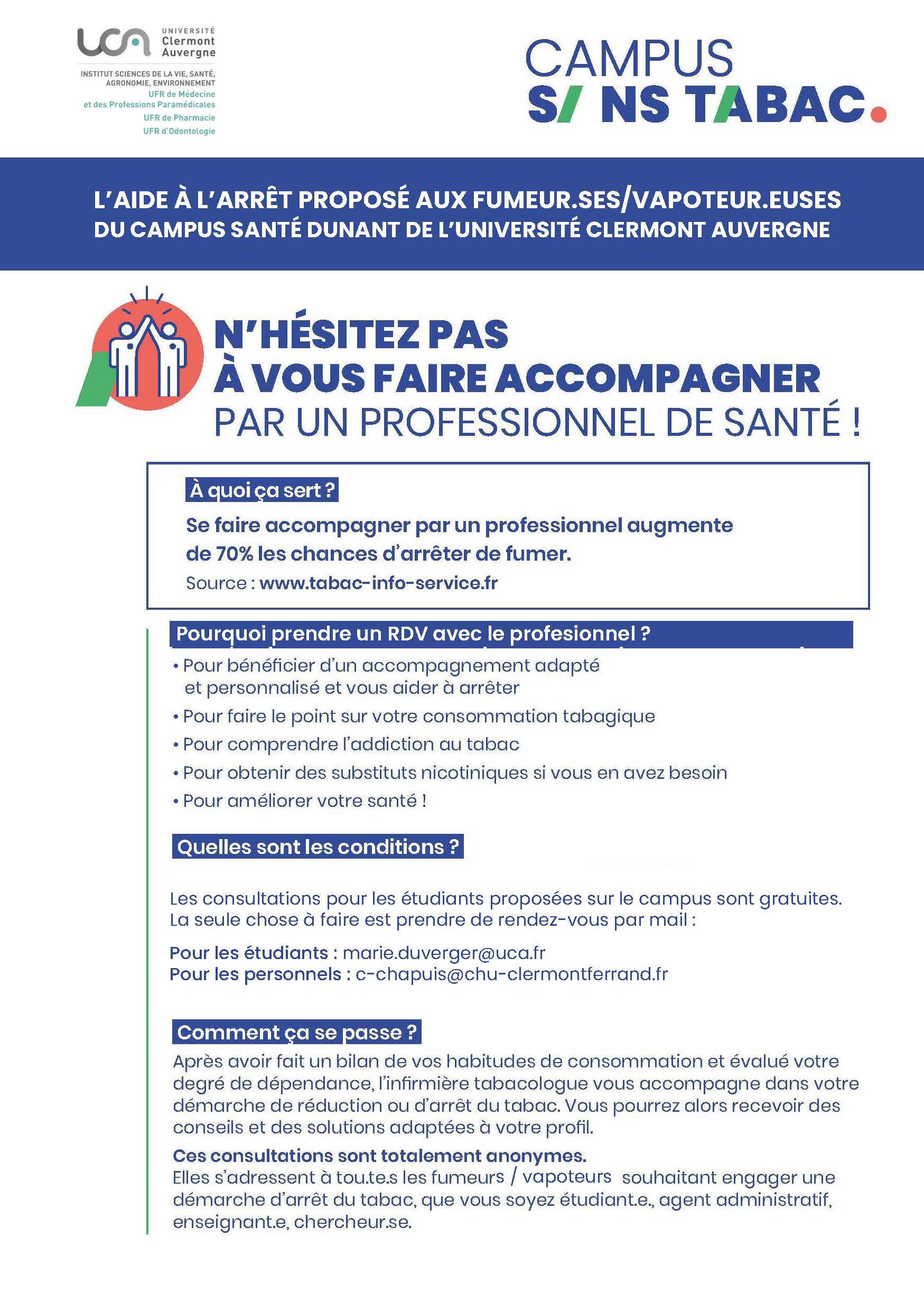 Une infirmière du Service de Santé Universitaire (SSU) spécialisée dans l'accompagnement addictions et l'arrêt du tabac sera présente sur le Campus Santé Dunant pour des consultations gratuites :